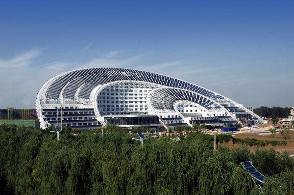 China struggles with massive air pollution challenges in their large cities. But there’s a jewel of green construction tucked away in the forests of Dezhou. The Sun-Moon Mansion is a multi-purpose facility that features solar paneling across its entire façade.